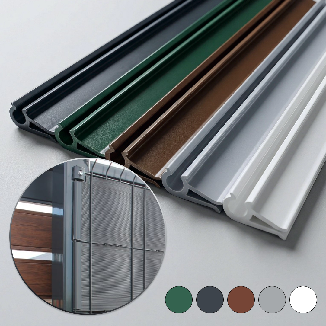 Зажим надевается на пруток 3д забора, лента подрезается в нужный размер и вставляется в паз зажима.